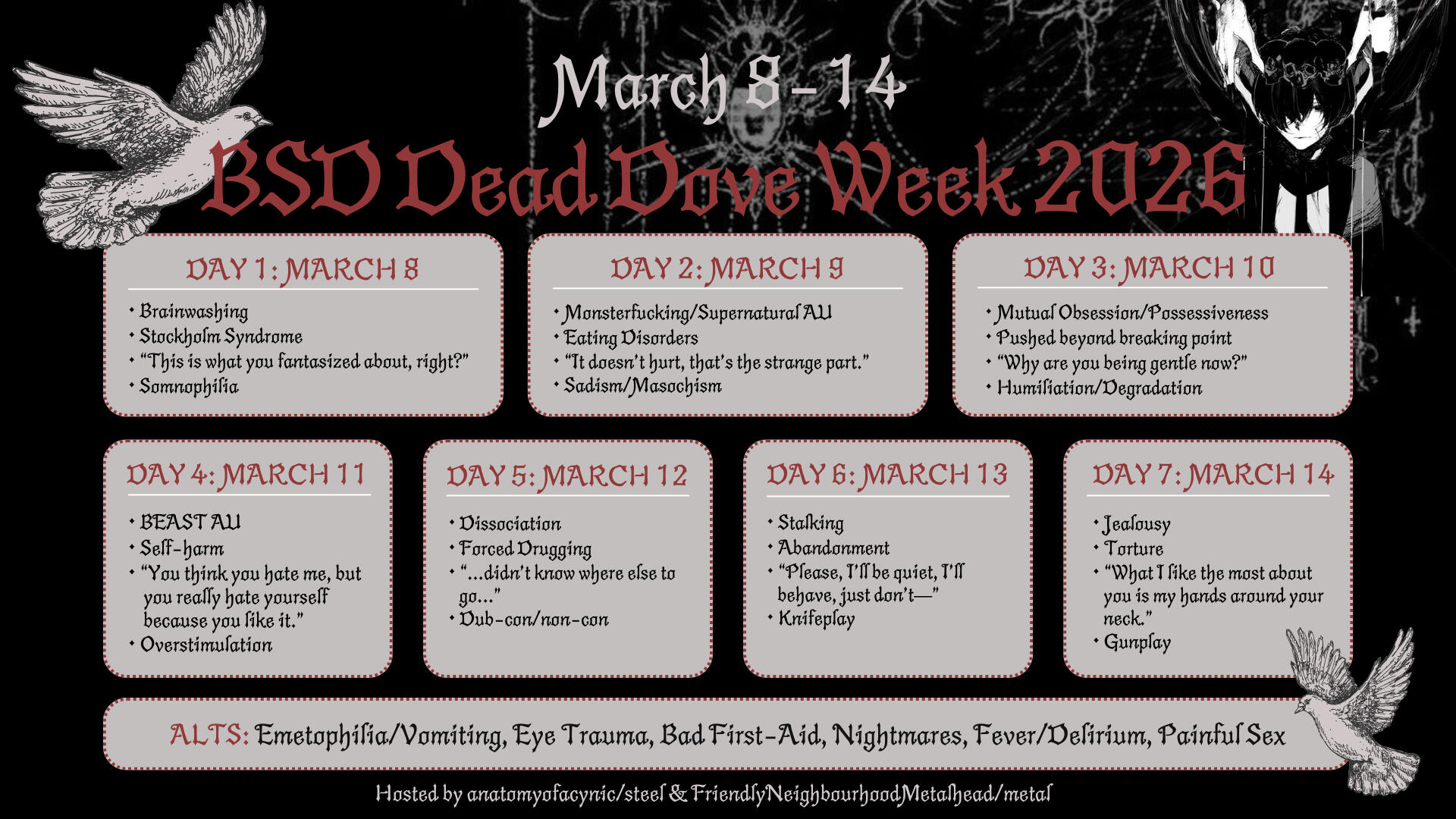 ⊹ Tag BSD Dead Dove Week 2026 or bsddeaddoveweek2026 and don’t forget to tag all the necessary content warnings too.